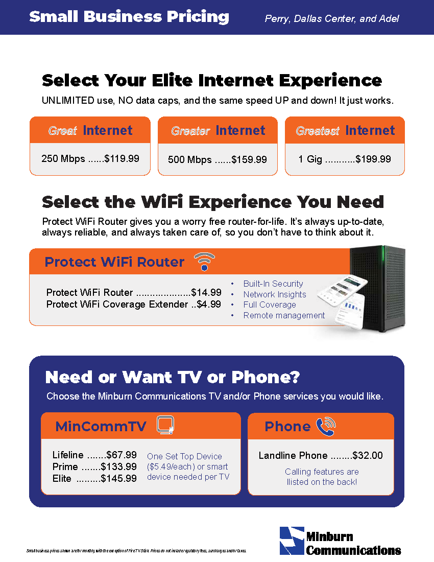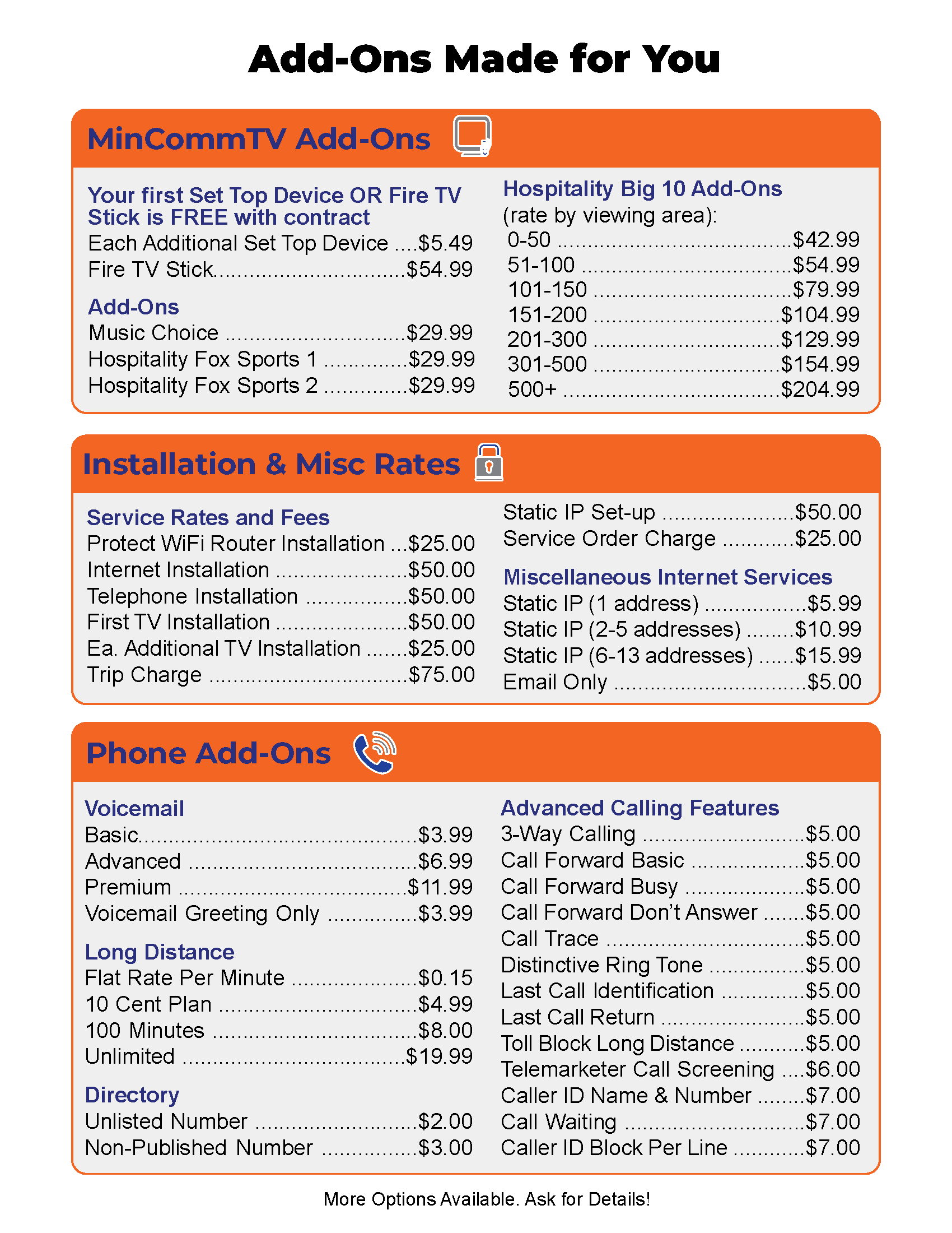 Ask Minburn Communications staff members about options to supplement your service with additional products or services that allow you to customize your experience. Contract options are available and may be good options for some customers.