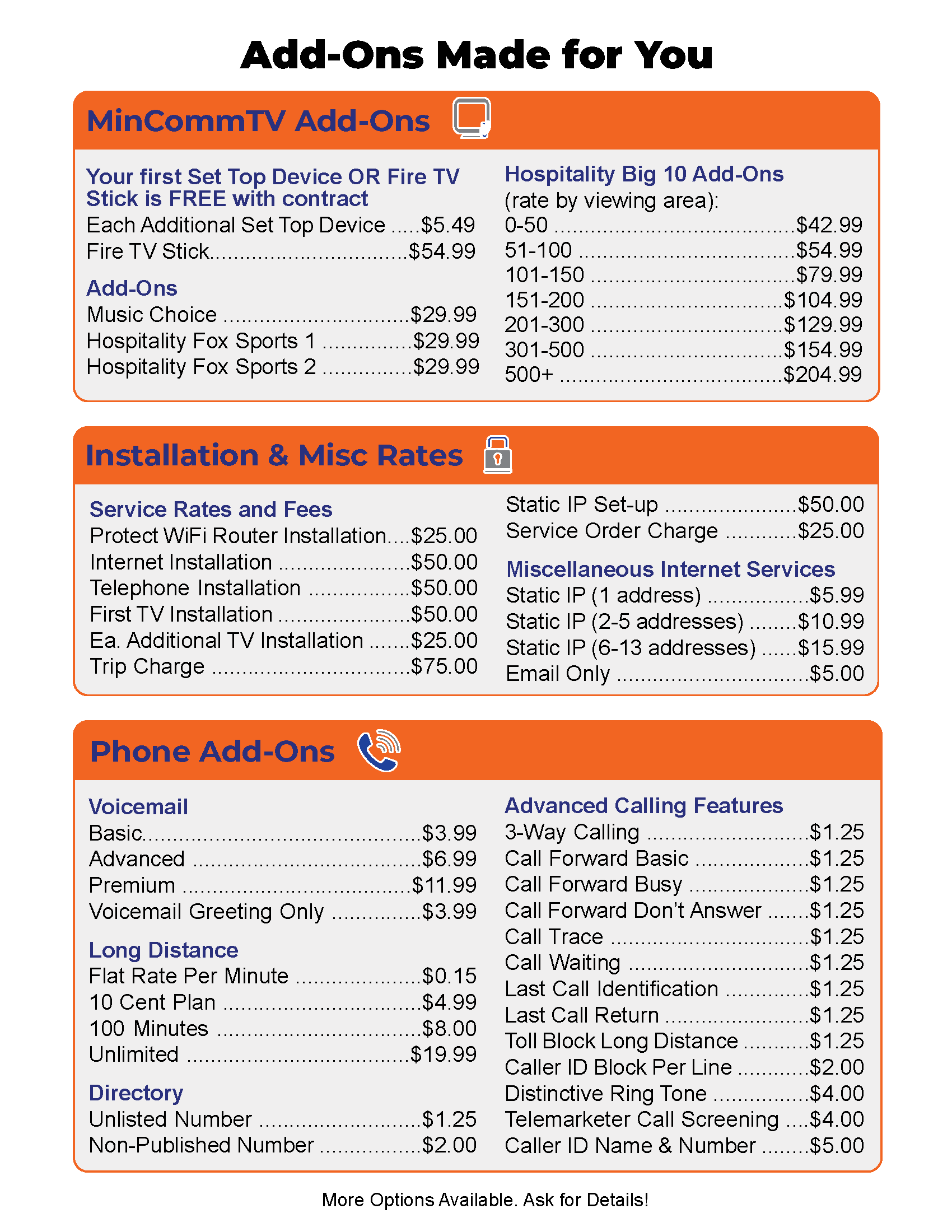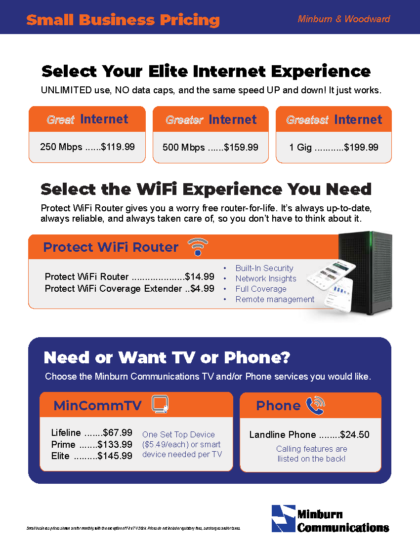 Ask Minburn Communications staff members about options to supplement your service with additional products or services that allow you to customize your experience. Contract options are available and may be good options for some customers.