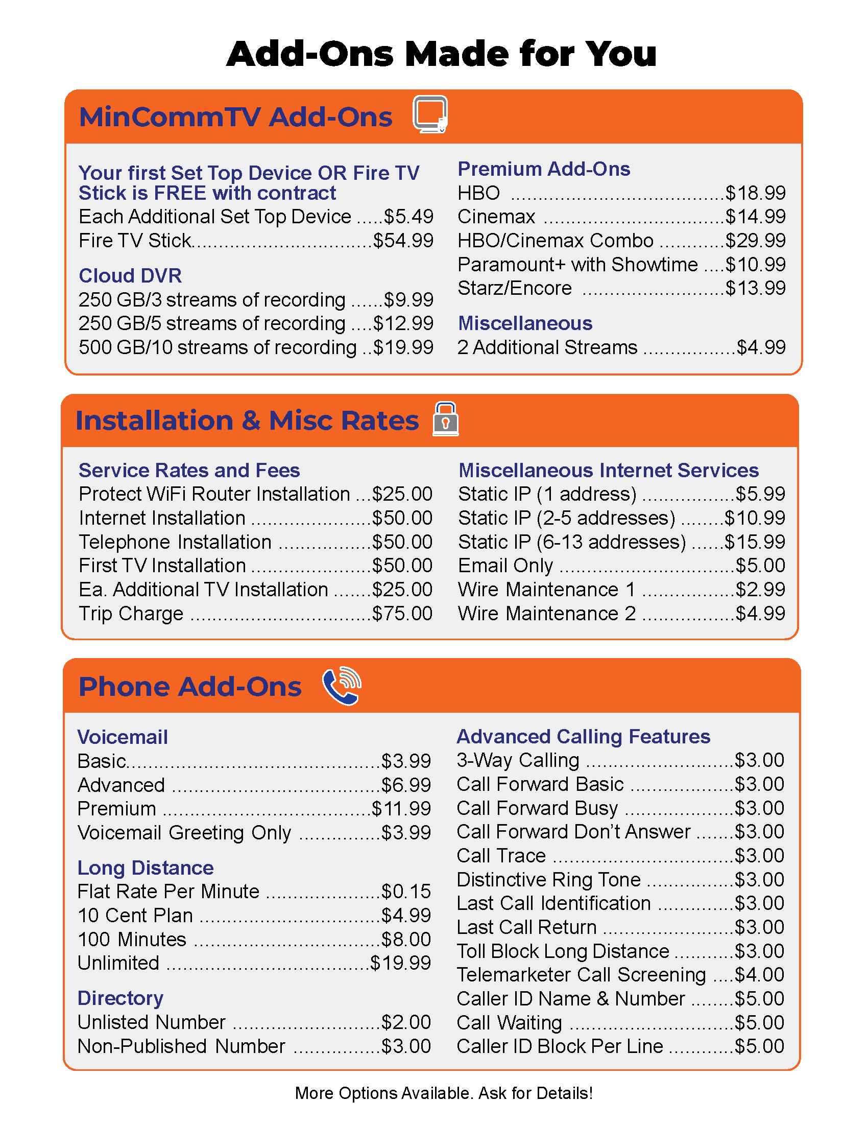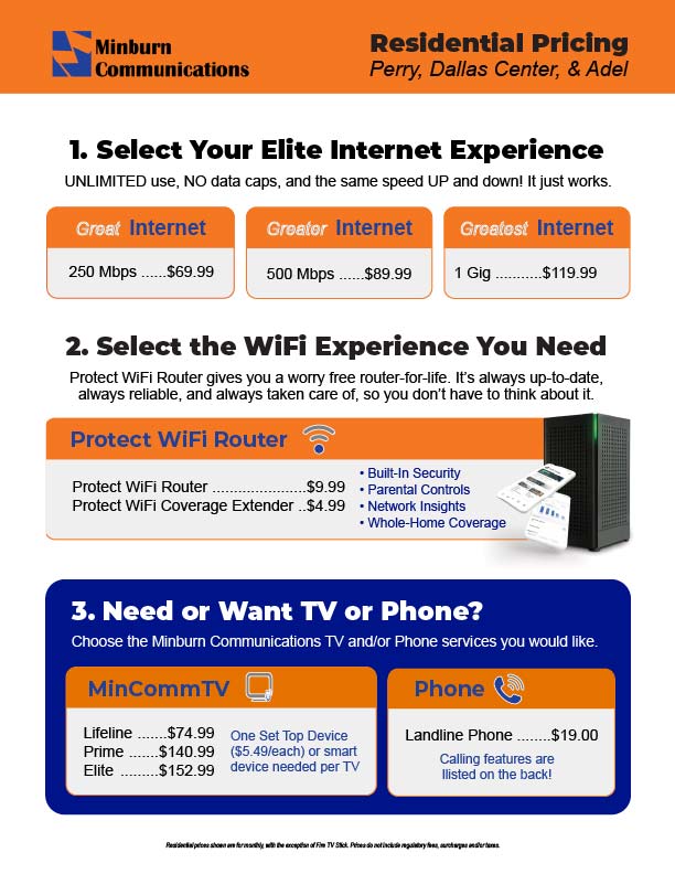 Ask Minburn Communications staff members about options to supplement your service with additional products or services that allow you to customize your experience. Contract options are available and may be good options for some customers.